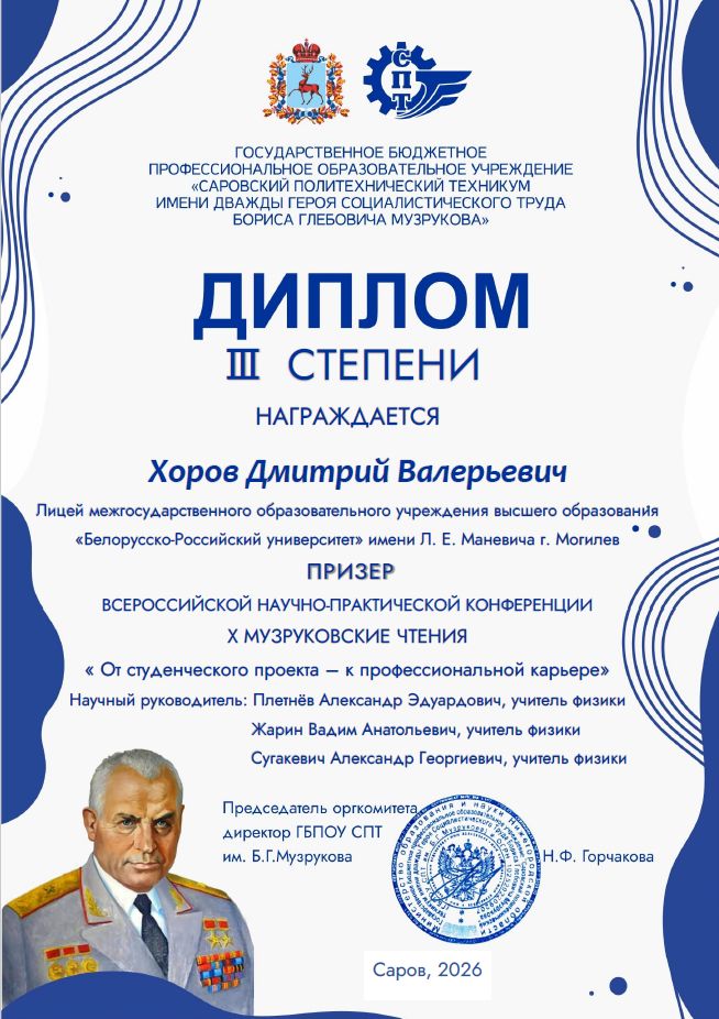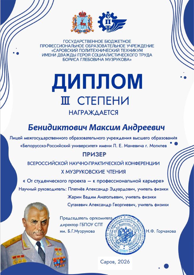 Подведены итоги международного конкурса научно-исследовательских и инженерно-технических проектных работ учащихся "Музруковские чтения " (г. Саров).
