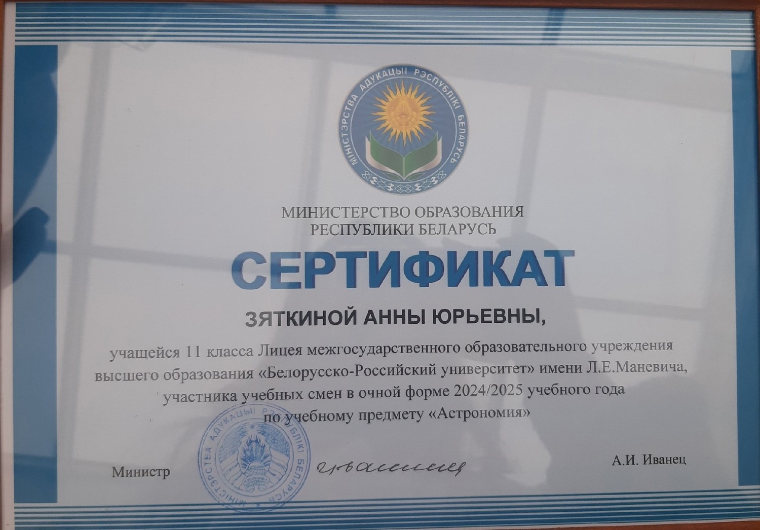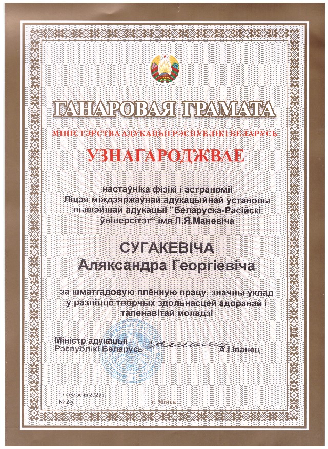 Учащийся лицея Максим Бенидиктович в награждён дипломом II степени Конкурса научно-технического творчества Союзного государства "Таланты XXI века".